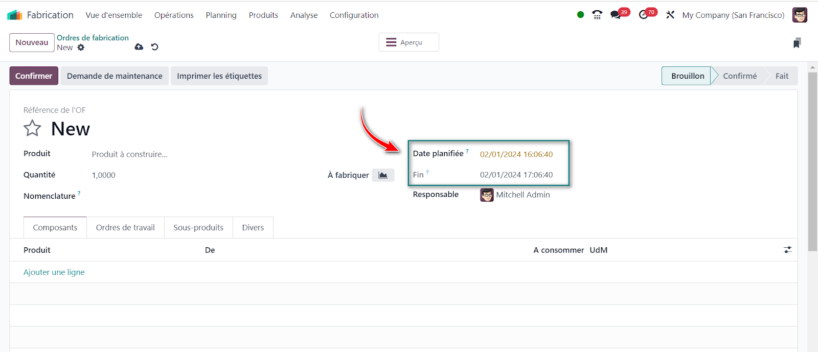 Consultez la disponibilité via la liste des ordres de fabrication. Intégrez la date de fin estimée dans la vue formulaire de l'ordre de fabrication.