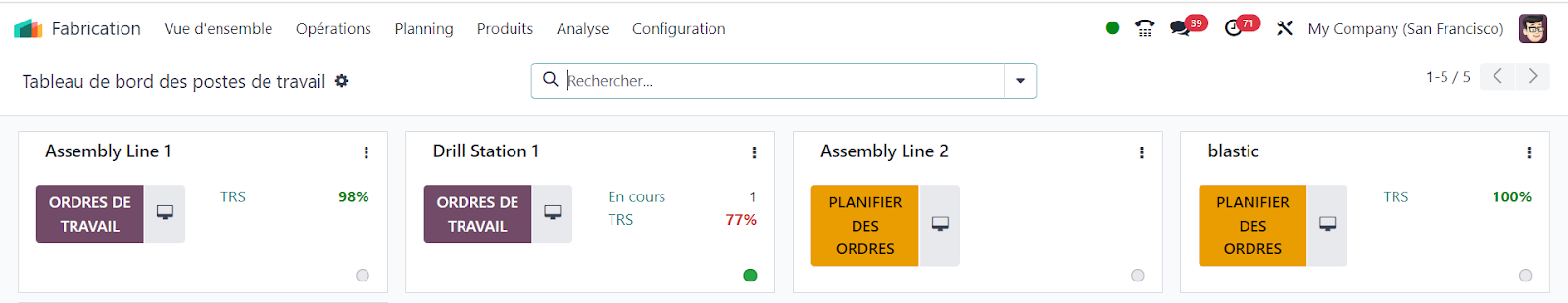 Perfectionnez votre chaîne de production avec l'application Atelier. Profitez d'un tableau de bord spécialement conçu pour les tablettes, vous permettant de coordonner efficacement les travailleurs, les postes de travail, les feuilles de travail, les tests de qualité, et bien d'autres éléments essentiels.