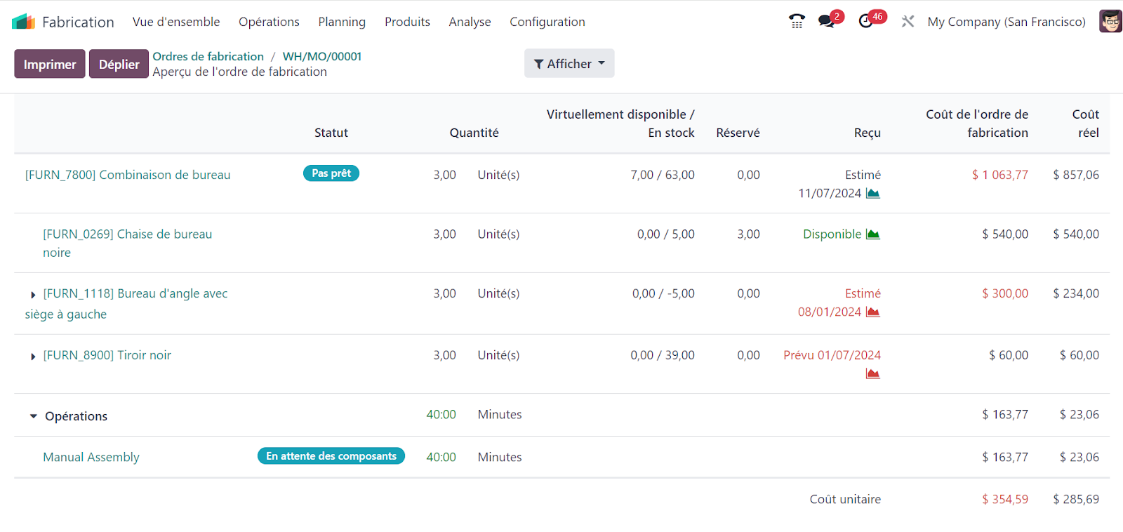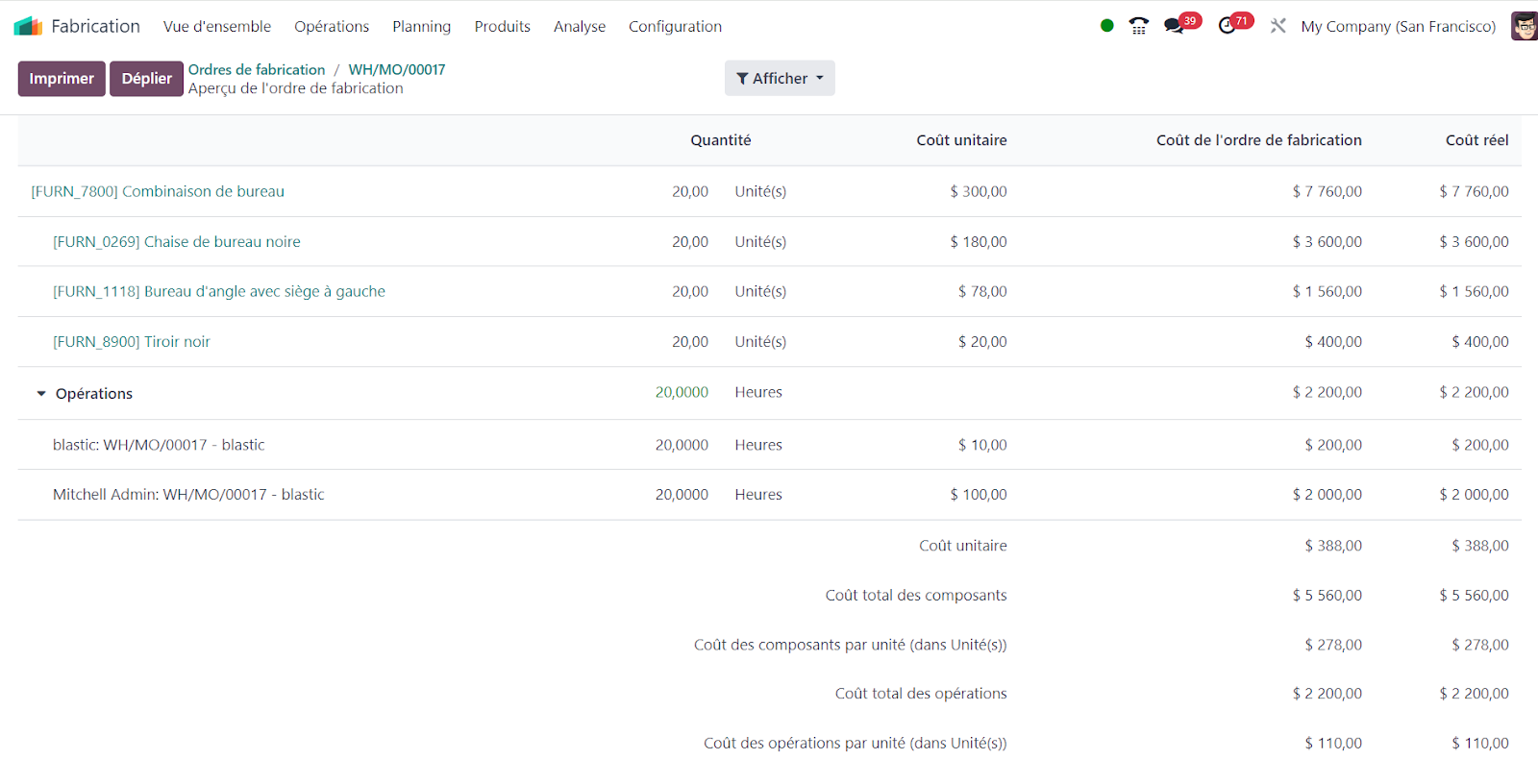 Obtenir une visibilité instantanée sur le coût actuel de l'ordre de fabrication (OF) en le confrontant aux prévisions de coûts avant, pendant et après l'achèvement de l'ordre de production.