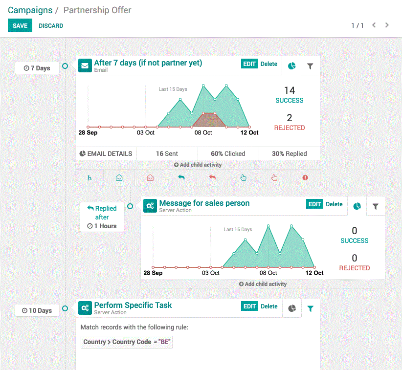 En matière d’automatisation marketing, Odoo propose une palette d’outils capables de déployer des campagnes multicanales — email, SMS, notifications push — avec des messages ciblés et personnalisés pour chaque segment de clientèle. Les workflows automatisés guident les prospects dans leur parcours d'achat de manière fluide, sans intervention manuelle. Cette fonctionnalité permet de concentrer les équipes sur des missions stratégiques, tandis que le CRM prend en charge l’optimisation de chaque interaction.