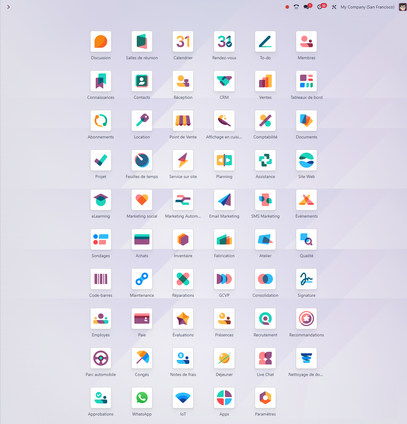 L'ergonomie exceptionnelle d'Odoo constitue un élément majeur de son attrait. En premier lieu, son interface conviviale se distingue par un design intuitif et moderne qui simplifie la prise en main pour les utilisateurs de tous niveaux. Chaque élément graphique est pensé avec soin, favorisant une expérience utilisateur naturelle et agréable. Les icônes ont été redessinées pour être plus modernes et pour avoir de meilleures visibilités.