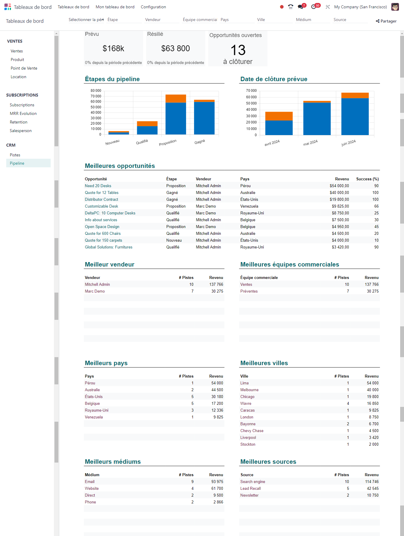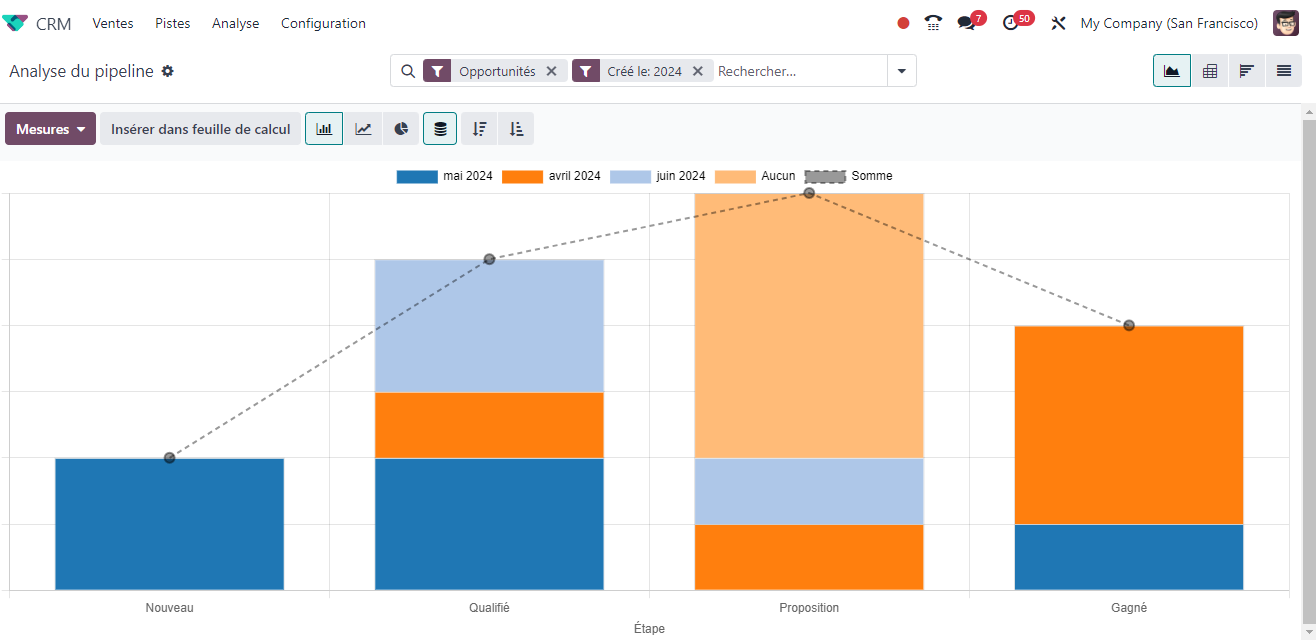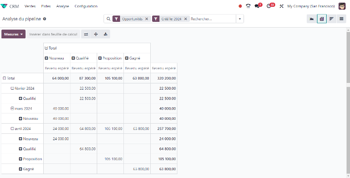 Les filtres et les regroupements sont faciles à utiliser, de plus plusieurs présentations de vue sont accessibles : vue liste, vue kanban, vue calendrier, etc… A cela s’ajoute la personnalisation des présentations des graphiques pour les rapports d’analyses : tableau, camembert, graphique empilé ou en ligne, etc…