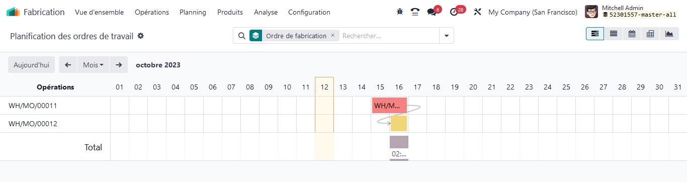 L'intégration avec la gestion de stocks assure une coordination parfaite de l'ensemble de votre chaîne de production. Vous disposez d’une interface pour votre programme directeur de production, ainsi que d’une vue gantt pour le planning de vos ordres de fabrication.