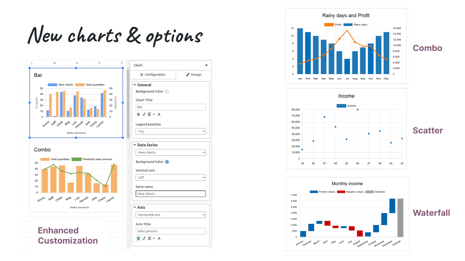 Les dernières mises à jour comprennent une réorganisation des fonctionnalités de reporting et des sorties telles que les commentaires sur les cellules, les listes et l'édition pivot, les tableaux de données et les nouvelles options graphiques. L'interface utilisateur des tableaux de bord a été améliorée, offrant de nouvelles fonctions de feuille de calcul et des fonctionnalités de gestion des données optimisées.