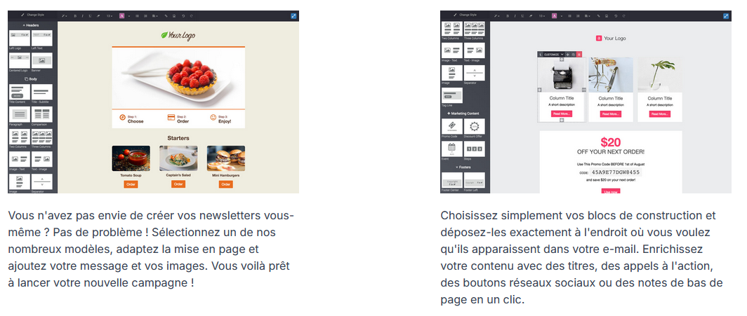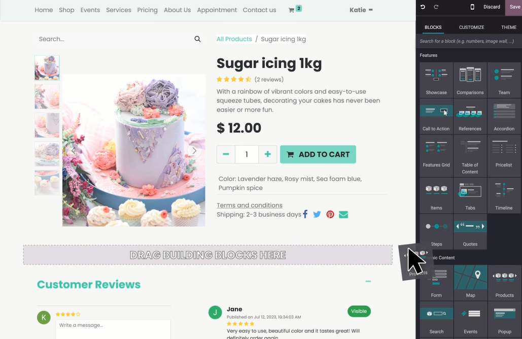L’éditeur de page d’Odoo repose sur un système de blocs préconstruits que vous pouvez glisser-déposer selon vos envies. Besoin d’un menu, d’un bouton d’appel à l’action ou d’une galerie d’images ? Ajoutez et ajustez ces éléments en un instant.