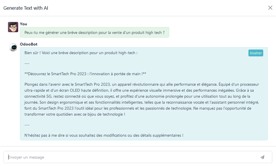Avec Odoo, créer du contenu n’a jamais été aussi simple. Grâce à ses outils intégrés et son IA avancée, vous pouvez rédiger des descriptions de produits, concevoir des landing pages ou enrichir votre blog. Plus besoin de jongler entre plusieurs outils : tout est à portée de main pour capter l’attention de vos visiteurs.