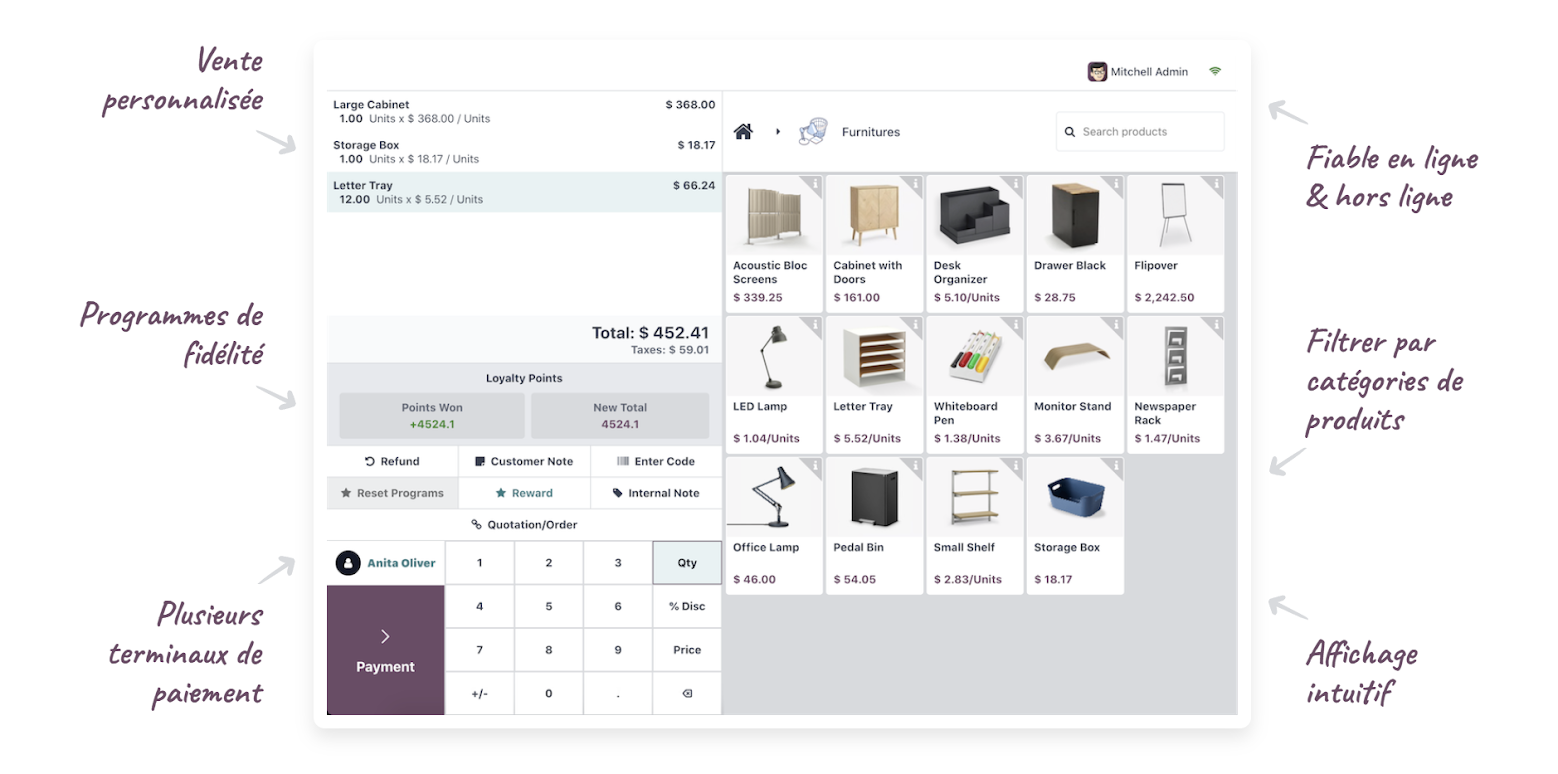 - Odoo Point de vente : Unifiez vos ventes en magasin et en ligne dans une seule plateforme facile d’utilisation. Gérez les commandes, les paiements, et les réservations en toute simplicité.